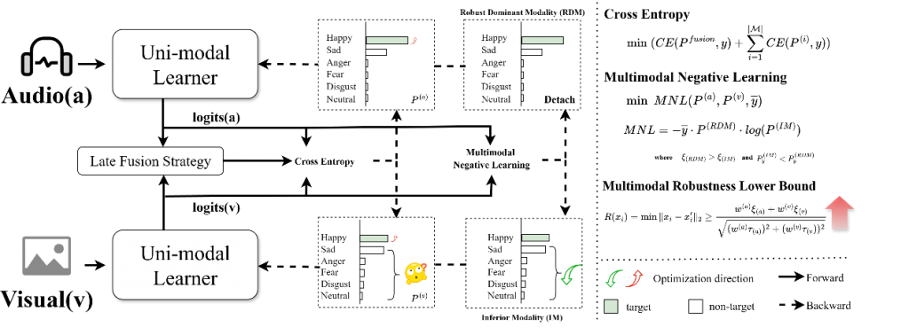 多模态学习在整合视觉、语音、文本等多源信息时,常面临模态不平衡问题,即不同模态之间在信息质量与可靠性上存在差异。当尝试利用优势模态引导弱势模态学习时,往往出现优势模态压制弱势模态表达的情况,导致后者的独特信息被过度对齐甚至丢失。同时,这种单向引导还可能放大主导模态的错误,从而削弱系统的整体鲁棒性。为解决上述问题,本文提出了一种新的学习范式, 多模态负向学习(Multimodal Negative Learning, MNL)。其核心思想并非强制弱势模态完成正确分类,而是由优势模态动态引导弱势模态学习如何排除非目标类别,从而稳定其决策空间,并避免因过度对齐而丢失模态的独特信息。在理论上, 我们在多模态晚期融合条件下, 基于单模态置信边距给出了鲁棒性下界的证明,为MNL的动态引导在提升系统鲁棒性上提供了理论保障。同时,MNL 可便捷嵌入现有的晚期融合方法。大量实验结果表明,该方法在多种数据集及不同噪声环境下均能提升模型准确性与鲁棒性,尤其在模态不平衡或高噪声场景中表现突出,为构建更加稳健和可信的多模态系统提供了一种全新的思路。